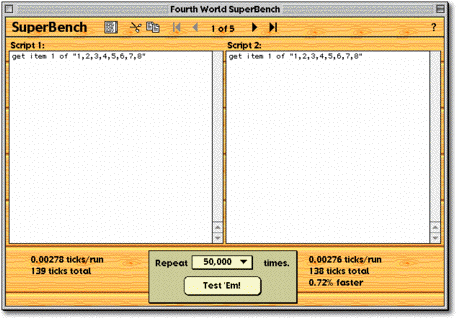 MetaBench / SuperBench / HyperBenchA series of benchmarking tools for Mac scripters In just about any programming language there are many ways to accomplish a given task. The trick is to find the one which executes fastest. I built SuperBench several years ago to compare the execution speeds of two different scripts. It simply runs each script multiple times and displays the total time for completion and notes which script is faster and by what percentage.