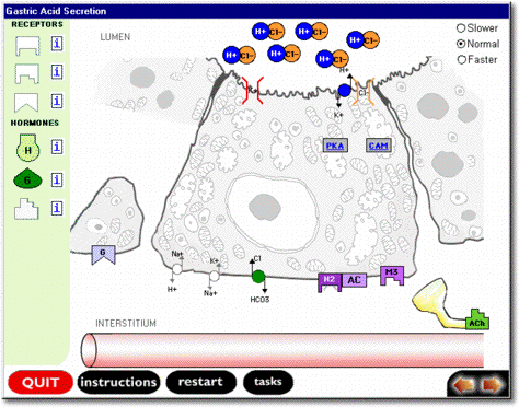 Gastric Acid Secretion TutorialFor Department of Physiology This tutorial makes extensive use of interactive animations to describe the process of Gastric Acid Secretions. The challenge Fourth World met with this project was to take this tutorial application from Mac to Windows using Revolution, without modifying the appearance of the program or the program itself.