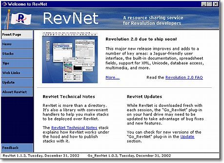 RevNetInternet application and service for Revolution and MetaCard developers. RevNet serves as proof-of-concept for the relative ease of building Internet applications with the Runtime Revolution. The system uses the MetaCard engine for both client and server-side operations.
