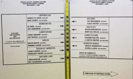 This problem was said to have been compounded by having had a sample ballot distributed in advance which looked visually similar but had two columns for the punch holes, one for each side of the listings. In the sample ballot, a punch in the second hole from the top would have indicated a vote for Gore.